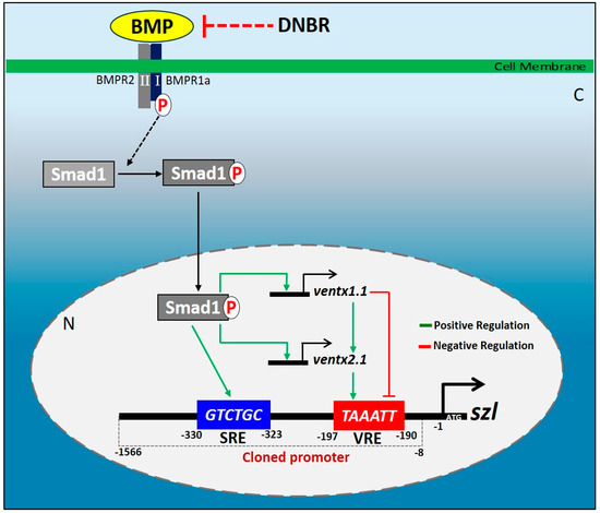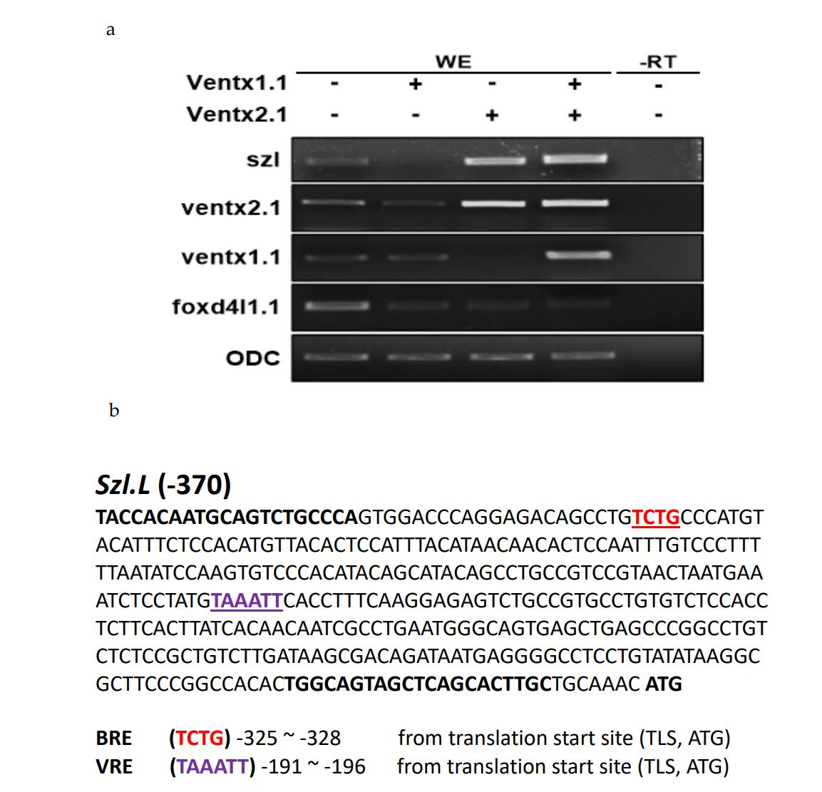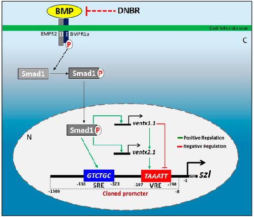 during early gastrulation. (b) Bmp4/Smad1 response elements (BRE) and Ventxs response elements (VRE) are highlighted in szl(-370) construct.