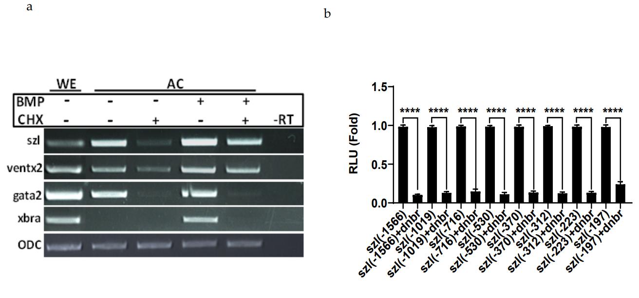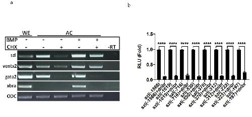 Figure S2. Bmp4 signaling directly targets szl gene expression during gastrulation.(a) RT-PCR of ventral specific genes including szl expression in the animal cap explants treated with bmp4 mRNA, cycloheximide and combination to check the direct and indirect targets of Bmp4 signaling. (b) Relative reporter gene assay was performed from Xenopus embryos treated with szl serially deleted constructs alone and in combination with dnbr mRNA. p ≤ 0.0001 for ****, ns(non-significant) were the assignments for significance.