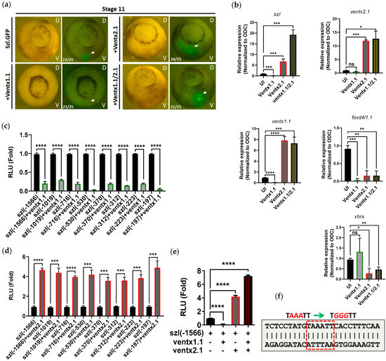 Figure 3. Ventx1.1 and Ventx2.1 mediated szl transcriptional modulation acts as a secondary Bmp4 signaling response: (a) Green fluorescence of embryos injected with szl(-1566)-eGFP+ in combination of ventx1.1 and/or ventx2.1 mRNAs at the one-cell stage was observed at stage 11. (25 embryos were injected per sample) (b) Embryos were injected with, without or with some combination of ventx1.1/ventx2.1 mRNAs. Animal cap explants (10 AC/sample) were dissected at stage eight and relative expression of ventral specific marker genes, including szl at gastrula stage, through quantitative RT-PCR was performed. Ct values were normalized to ODC, a housekeeping gene. (c) Serially deleted constructs of the szl promoter were injected with or without ventx1.1 and (d) ventx2.1 mRNAs. Reporter gene activities were analyzed. (e) Szl (-1566)-expressing embryos were injected with, without or with some combination of ventx1.1/ventx2.1 mRNAs and analyzed for luciferase activity. (b–e) p ≤ 0.05 for *, p ≤ 0.01 for **, p ≤ 0.001 for ***, p ≤ 0.0001 for ****, ns (non-significant) were the assignments for significance. (f) Fragment of szl promoter having the putative Ventx response elements (VRE, highlighted within the dashed red box).