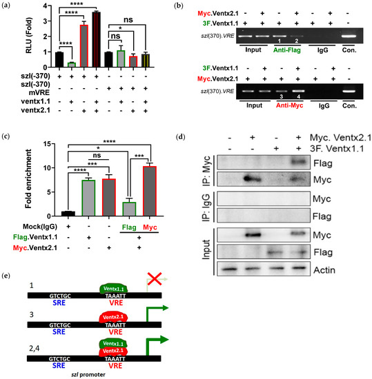 Figure 4. One VRE (ventx cis-acting response element) site for Ventx1.1/2.1 binding in szl promoter is required for szl transcription: (a) Szl(-370) wild type or szl(-370)mVRE were injected with the indicated mRNAs and their combination. Luciferase activities of the samples were analyzed. (b) Embryos (300 embryos/sample) were injected alone or with the combination of 3flag-ventx1.1 and myc-ventx2.1 mRNAs (1 ng/embryo) and cultured to the gastrula stage. ChIP-PCR analysis using specific primers for szl promoter region having the VRE site was performed. (c) Graph represents the relative band intensities of ChIP-PCR bands. (a,c) p ≤ 0.05 for *, p ≤ 0.001 for ***, p ≤ 0.0001 for ****, ns (non-significant) were the assignments for significance. (d) Immunoprecipitation assay were performed for 3F.Ventx1.1 and Myc.Ventx2.1 protein-protein interaction during szl promoter binding. (30 embryos/sample) (e) A model of Ventx1.1/2.1 alone and combination mediated regulation of szl transcription. The numbers indicate the number of lane shown on (e), indicating that each schematic model diagram is related with and based on the result(s) of lane(s) shown on (b).