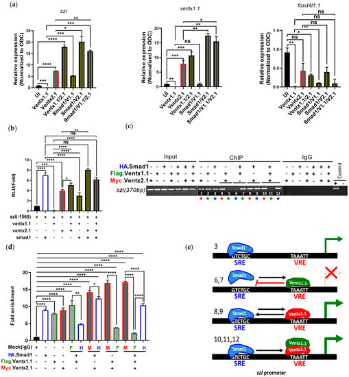 Figure 5. Smad1 enhances Ventx2.1-mediated szl activation and rescues Ventx1.1 mediated szl suppression. (a) Embryos were injected with smad1, ventx1.1 and ventx2.1 mRNAs individually and in different combinations. Animal cap explants (10 AC/sample) were dissected at stage eight and quantitative RT-PCR of ventral specific marker genes including szl at gastrula stage were analyzed. V1.1 = Ventx1.1, V2.1 = Ventx2.1 (b) Szl(-1566) promoter construct were injected with smad1, ventx1.1 and ventx2.1 mRNA alone and possible combinations and reporter gene activities were analyzed. (c) Xenopus leavis embryos (300 embryos/sample) were injected with ha.smad1, 3flag.ventx1.1, myc.ventx2.1 mRNAs alone and their possible combinations (0.5 ng/embryo each) and cultured to the gastrula stage. ChIP-PCR analysis using specific primers for the szl promoter region having the VRE site was performed. The asterisks of different colors indicate the difference of antibodies used for ChIP; red (*) for Myc.Ventx2.1, green (*) for Flag.Ventx1.1 and blue (*) for HA.Smad1. (d) Quantitative PCR analysis was performed with fold enrichment method and the experiment was repeated three times. (a,b,d) p ≤ 0.05 for *, p ≤ 0.01 for **, p ≤ 0.001 for ***, p ≤ 0.0001 for ****, ns (non-significant) were the assignments for significance. (e) A model of Smad1 and Ventx1.1/2.1 alone and in combinations mediated regulation of szl transcription. The numbers indicate the number of lane shown on (c), indicating that each schematic model diagram is related with and based on the result(s) of lane(s) shown on (c).