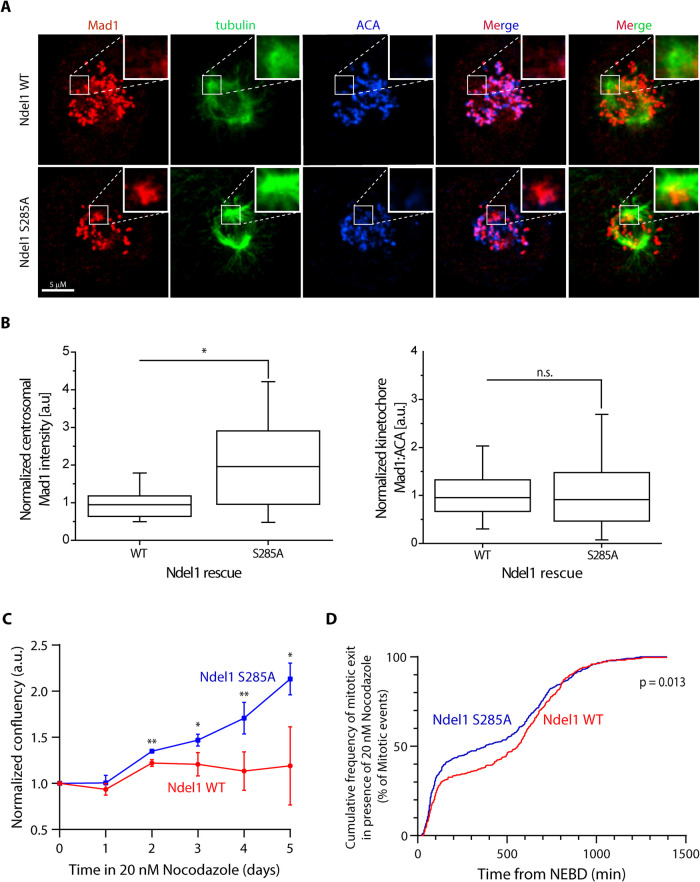 Aurora A phosphorylates Ndel1 to reduce the levels of Mad1 and NuMA at spindle poles.