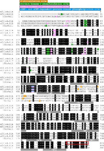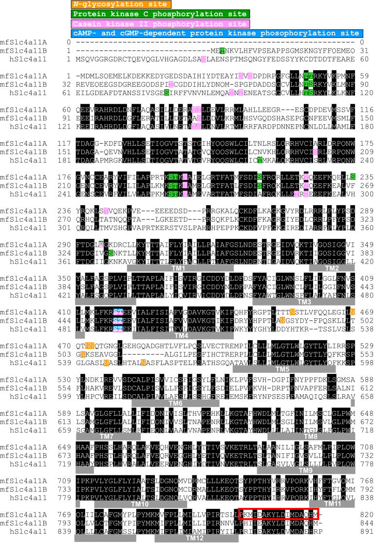 Figure 3. Multiple alignment of amino acid sequences of Slc4a11 family. The amino acid residues that are conserved among Slc4a11 family members are shaded. Transmembrane (TM) regions are indicated by solid bars labeled as TM1–TM12. The accession numbers of mfSlc4a11A, mfSlc4a11B, and hSLC4A11 are AB534190, AB534191, and NM_032034, respectively. h, human; mf, mefugu. Red box of mfSlc4a11A indicates the peptide antigen used to generate the mfSlc4a11A antibody. |