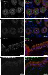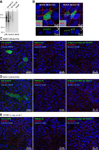 Figure 4. Validation of the antibody against Slc4a11. A, Western blot analysis of HEK293 cells transfected with pcDNA3 (mock), pcDNA3-Slc4a11A, or pcDNA3-Slc4a11B. The membrane fractions of the cells were incubated with (+) or without (–) glycosidases and analyzed using anti-Slc4a11 antiserum (left) and antigen-absorbed antiserum (right). B, polarized distribution of Slc4a11A and Slc4a11B in MDCK cells. Anti-Slc4a11 antiserum (green), anti-ZO-1 antibody (red), and Hoechst 33342 (blue) were used to stain MDCK cells transiently transfected with pcDNA3-Slc4a11A or pcDNA3-Slc4a11B. Confocal XY maximum projection image and XZ (vertical) sections are shown. C-E, anti-Slc4a11 antiserum (left panel), preimmune serum (center panel), or antigen-absorbed antiserum (right panel) (green) were used with anti-ZO-1 antibody (red) and Hoechst 33342 (blue) to stain MDCK cells transiently transfected with pcDNA3-Slc4a11A, pcDNA3-Slc4a11B, or pcDNA3 (mock). Confocal XY maximum projection images are shown. |