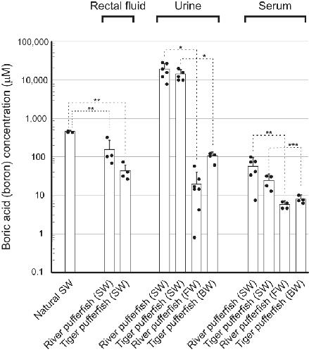 Figure 1. Urinary boric acid excretion by pufferfish in seawater (SW). Boric acid or boron concentrations of serum (n = 4–6), urine (n = 6–7), and rectal fluid (n = 4) of pufferfish acclimated to brackish water (BW), fresh water (FW), and natural SW are shown. Dots represent individual data. Bar graphs represent means ± SD. ∗p < 0.0001, ∗∗p < 0.0002, and ∗p < 0.05. |
