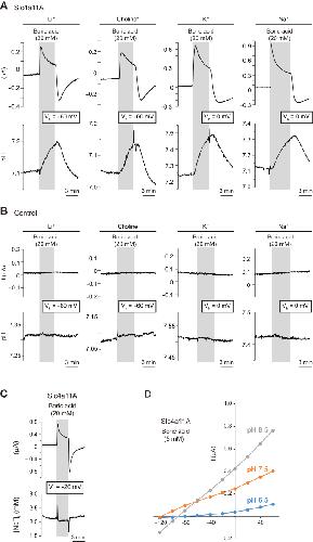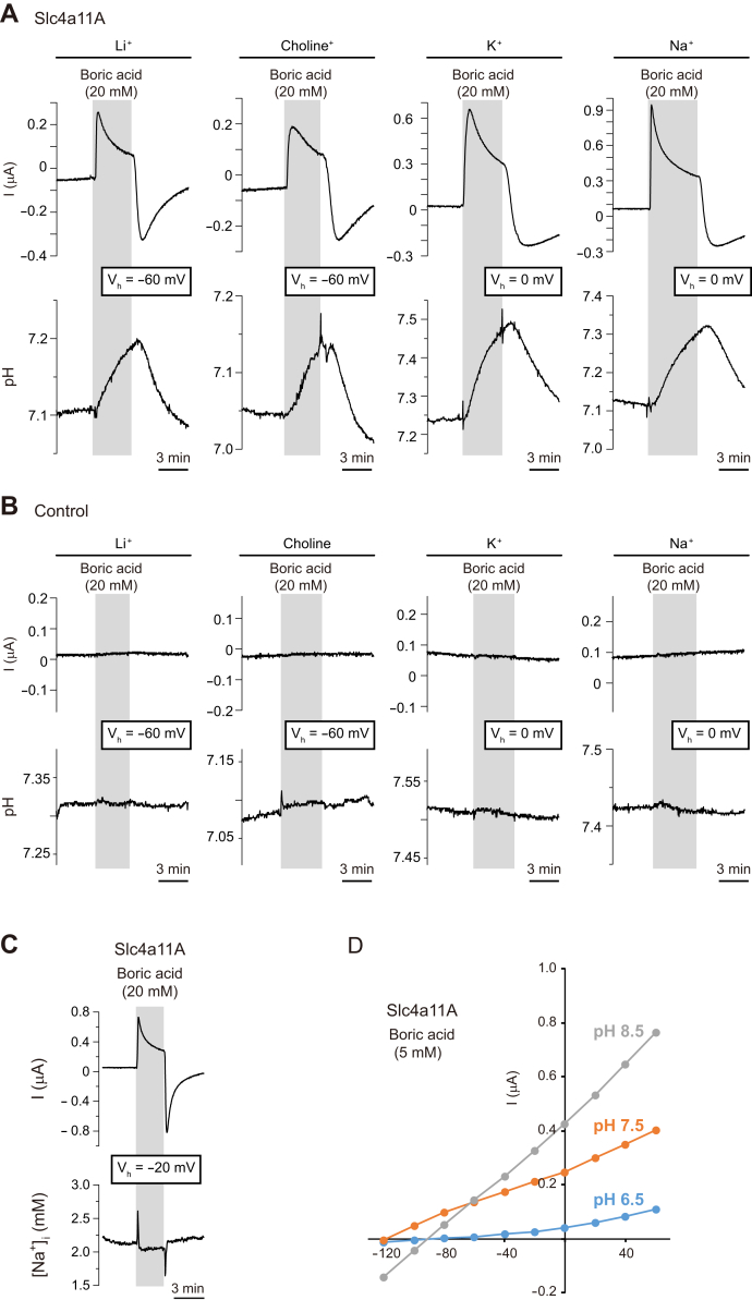 Figure 8. Ion-selective microelectrode analysis during Vm clamping and pH dependence of Na+-independent electrogenic boric acid transport activity of Slc4a11A. Representative traces of boric acid–elicited currents (holding potential Vh: −60 or 0 mV) and changes in intracellular pH of Slc4a11A (A) and control (B) oocytes. Oocytes were analyzed in ND96 (indicated by Na+) or similar media in which Na+ was replaced with Li+, choline, or K+. C, representative traces of boric acid–elicited currents (holding potential, −20 mV) and intracellular [Na+] of Slc4a11A oocyte. D, current–voltage (I–V) relationship of 5 mM boric acid–elicited currents in various pH conditions. Values are means (n = 4 to 5). Slc4, solute carrier family 4. |