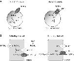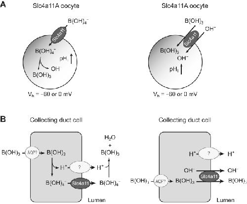 Figure 10. Model of electrogenic boric acid transport activity of Slc4a11A. A, schematic representation of B(OH)4− uniporter (left) or B(OH)3-OH− cotransporter (right) activity of Slc4a11A in Xenopus oocytes. B(OH)3/H+ exchange activity is equivalent with B(OH)3-OH− cotransport activity. B, hypothetical model of the epithelial secretion system for boric acid in the collecting duct cell of SW fish. Apical Slc4a11A mediates the B(OH)4− uniport (left) or B(OH)3-OH− cotransport (right), and the negative membrane potential and acidic pH of urine may be the driving forces for the luminal boric acid secretion. The activity of Slc4a11A may be coupled with apical H+-efflux systems, such as the Na+/H+ exchanger 3 (NHE3) or V-type H+-ATPase. Basolateral entry of boric acid from the plasma to the cytoplasm may be mediated by AQPs. AQP, aquaporin; Slc4a, solute carrier family 4; SW, seawater. |