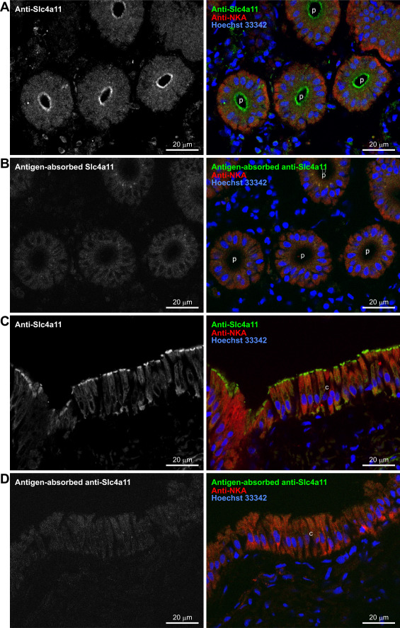 Figure 5. Immunolocalization of Slc4a11 in renal tubules of SW-acclimated river pufferfish. Serial frozen sections of mefugu kidney were stained with anti-Slc4a11 antiserum (A and C) or antigen-absorbed anti-Slc4a11 antiserum (B and D) (green), anti-Na+-K+-ATPase (NKA) antibody (red), and Hoechst (blue). Bars represent 20 μm. c, collecting duct; p, proximal tubule; Slc4, solute carrier family 4; SW, seawater. |