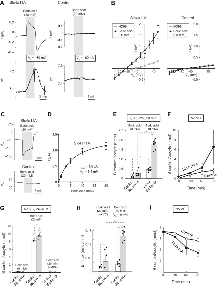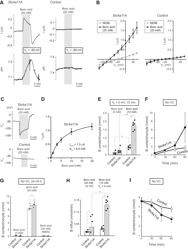 Figure 6. Boric acid transport mediated by Slc4a11A. A, representative traces of boric acid–elicited currents and changes in intracellular pH of voltage-clamped oocytes (holding potential Vh: −60 mV) injected with Slc4a11A or water (control). B, current–voltage (I–V) relationships of oocytes expressing Slc4a11A and control oocytes in the presence or the absence of 20 mM boric acid. Values are means ± SD, n = 5 to 8. C, representative traces of boric acid–elicited changes of membrane potential (Vm) of oocytes injected with Slc4a11A and water (control). D, Michaelis–Menten curve fitted to boric acid–elicited currents of oocytes expressing Slc4a11A at +60 mV. Boric acid–elicited currents were measured by the addition of 1, 3, 5, 10, and 20 mM boric acid and were calculated as I(boric acid) – I(no boric acid). Maximum current (Imax) and Michaelis–Menten constant (Km) are shown. Values are means ± SEM, n = 3. E, boric acid uptake by voltage-clamped oocytes. Slc4a11A oocytes and control oocytes were voltage clamped (Vh: 0 mV) in ND96 containing 10 mM boric acid for 10 min, and the amount of boron in each oocyte was measured by ICP-MS. Dots represent individual data. Bar graphs represent means ± SD, n = 6. F, time course of boric acid uptake by unclamped oocytes. Oocytes were incubated in an ND96 medium containing 20 mM boric acid for 30, 60, and 90 min, and the amount of boron in each oocyte was measured by ICP-MS. Values are means ± SD, n = 4. G, boric acid uptake by unclamped oocytes. Oocytes were incubated in test solutions for 24 to 40 h, and the amount of boron in each oocyte was measured by ICP-MS. Dots represent individual data. Bar graphs represent means ± SD, n = 4. No VC, unclamped. H, rates of boric acid influx in voltage-clamped (Vh: 0 mV) and unclamped oocytes. The rates were calculated from data shown in (E and F). Dots represent individual data. Bar graphs represent means ± SD, n = 4 to 6. I, time course of boric acid efflux by unclamped oocyte. Oocytes were incubated in an ND96 medium containing 20 mM boric acid for 24 h until saturated, followed by incubation in ND96 for 5, 10, and 20 min, and the amount of boron in each oocyte was measured by ICP-MS. Values are means ± SD, n = 4. ICP-MS, inductively coupled plasma mass spectrometry; Slc4, solute carrier family 4. |