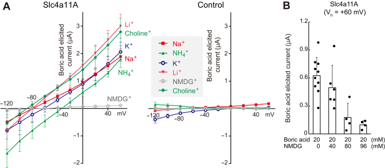 Figure 7. Voltage-clamp analyses of Na+-independent electrogenic boric acid transport activity of Slc4a11A. A, current–voltage (I–V) relationships of Slc4a11A or water-injected (control) oocytes in a solution containing 20 mM boric acid and various cations. Boric acid–elicited currents calculated by subtraction are shown (n = 3 to 6). B, dose-dependent inhibition of boric acid transport activity of Slc4a11A by NMDG. Boric acid–elicited currents of Slc4a11A oocytes (holding potential Vh: +60 mV) in the presence of various concentrations of NMDG are shown. Values are means ± SD (n = 4 to 10). NMDG, N-methyl-d-glucamine; Slc4, solute carrier family 4. |