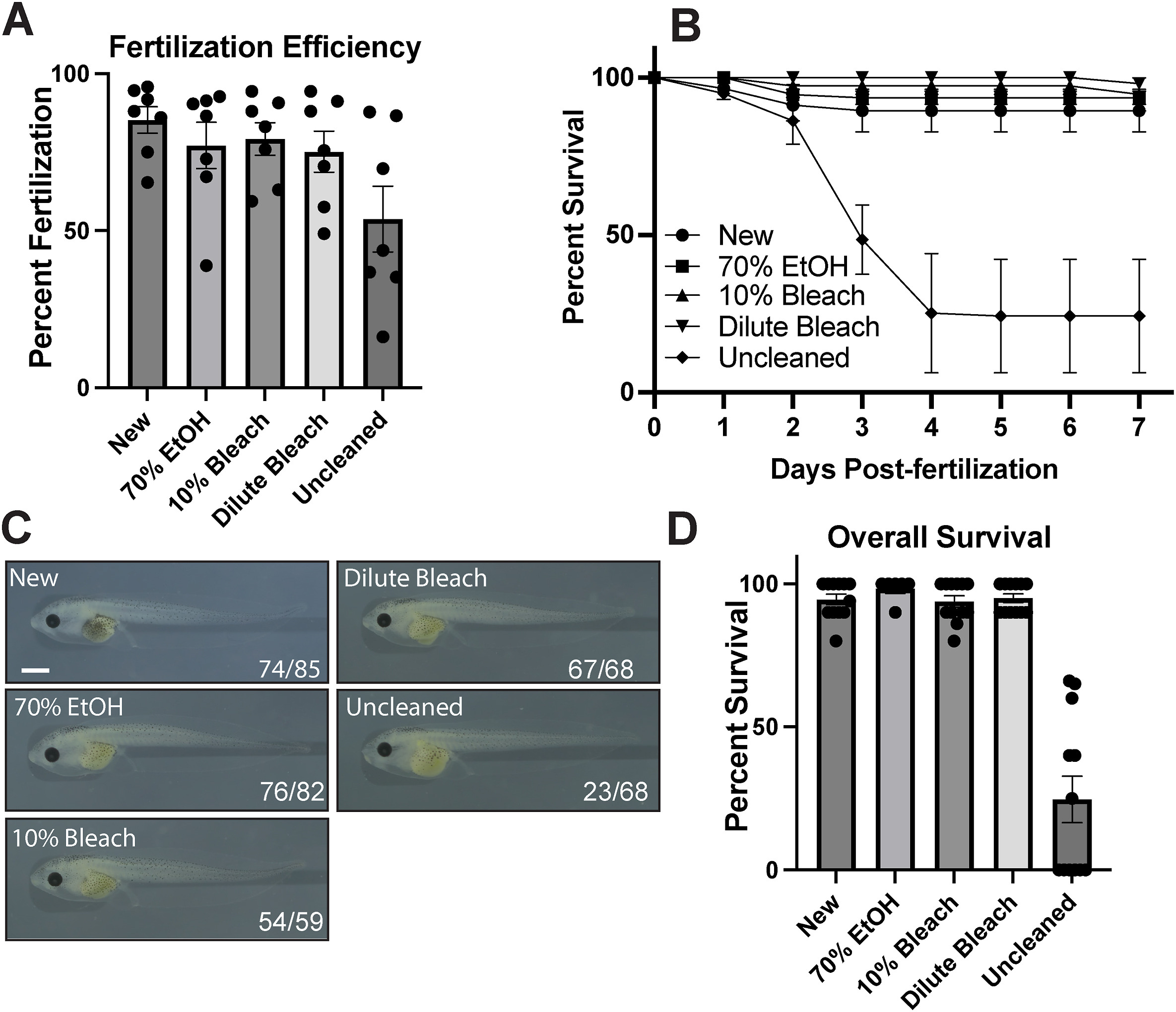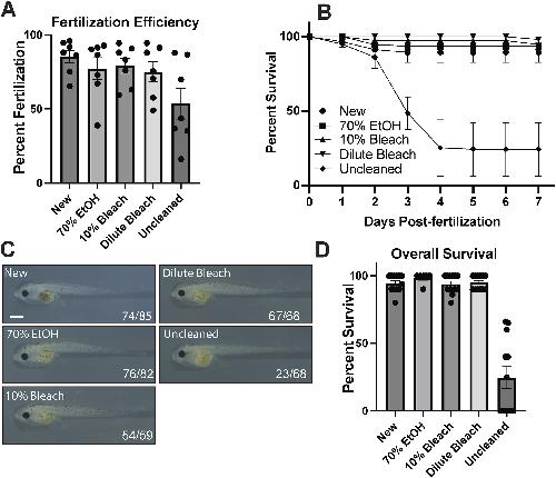 Fig. 2. Post-fertilization survival in cleaned culture dishes. A. Plot of average fertilization rates in dishes subjected to the indicated treatments. B. Survival curve in percentages of embryos fertilized and cultured in dishes subjected to the indicated treatments. Error bars show +/- S.E.M. C. Representative embryos from the experiments quantified in B. Anterior to the left and dorsal to the top. Scale bar: 1000 um. Numbers indicate prevalence of the observed phenotype. D. Plot of overall survival in dishes subjected to the indicated treatments. Error bars show +/-S.E.M. Data points show individual replicates.