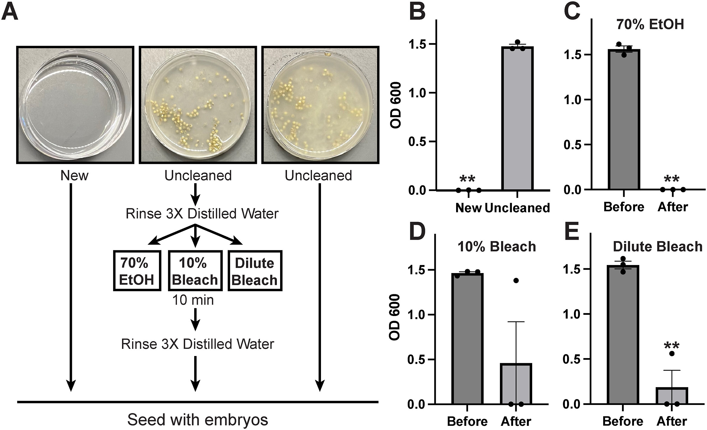 Fig. 1. Cleaning methods for reusing plastic culture dishes. A. Schematic illustrating the experimental design and different methods used to clean dishes. B. Means of OD 600 readings (+/-S.E.M.) of microbial cultures from indicated dishes. C. Means of OD 600 readings (+/-S.E.M.) of microbial cultures from dishes before and after cleaning with 70% EtOH. D. Means of OD 600 readings (+/-S.E.M.) of microbial cultures from dishes before and after cleaning with 10% bleach. E. Means of OD 600 readings (+/-S.E.M.) of microbial cultures from dishes before and after cleaning with dilute bleach. Error bars show +/-S.E.M. Data points show individual replicates.**indicates p < 0.001 (Pairwise T-test).
