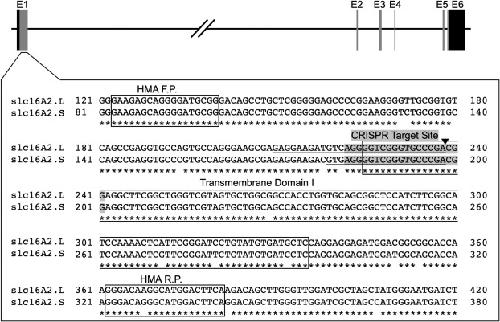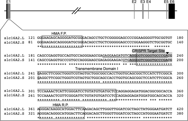 Fig. 1. CRISPR/Cas9 target site for slc16a2. The gene encoding MCT8, slc16a2, has 6 exons labeled E1-6, with the coding region shown as vertical grey bars and the 5′ and 3′ untranslated regions shown as vertical black bars. The DNA sequences from the L- and S-chromosomes around the CRISPR target site in Exon 1 are shown in the large, boxed area. Gaps in the asterisks below the slc16a2.L and slc16a2.S sequences show sequence divergence between the two slc16a2 loci. The exact CRISPR target site, i.e., the sgRNA sequence, is shaded, and the Cas9 cut site is shown by the black triangle. The 29-base pair deletion in slc16a2.L and the 20-base pair deletion in slc16a2.S are underlined. The forward and reverse primers used in the heteroduplex migration assay (HMA F.P, HMA R.P) and the first transmembrane domain required for MCT8 function are boxed.