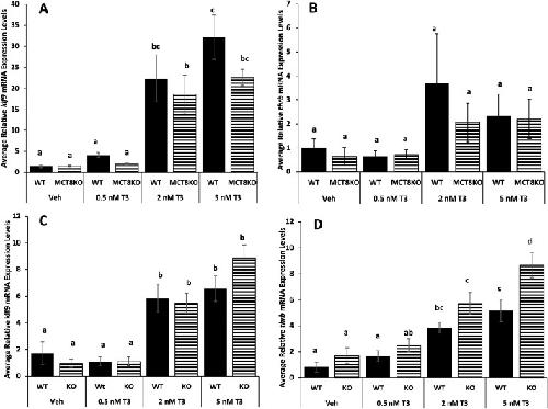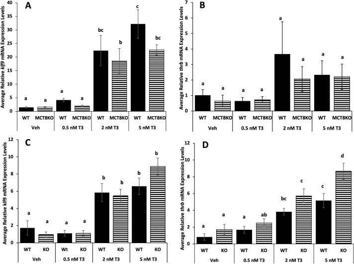 Fig. 7. Tissue sensitivity to TH in tail and hindlimbs among MCT8 genotypes. Premetamorphic F3 tadpoles (NF 54) were treated for 24 hrs with 0, 0.5, 2, and 5 nM T3 (tri-iodothyronine) added to their rearing water, and then their tails and hindlimbs were harvested and processed for quantitative PCR. The RNA expression of the TH response genes, (A,C) Krüppel-like factor 9 (klf9) and (B, D) TH receptor beta (thrb) in tail (A,B) and hindlimbs (B,C) among MCT8 genotypes. Means and standard error for each genotype are shown, n = 10 for all genotypes and T3 treatments. WT = wild-type (LLss), MCT8KO = homozygous knockout (llss). Letters indicate significant differences among bars determined for each genotype based on non-parametric Kruskal-Wallis test followed by pairwise comparisons using Wilcoxon rank sum exact test (A, B and D) and two-way ANOVA followed by pairwise comparisons using Tukey’s post hoc test (C). p < 0.05.