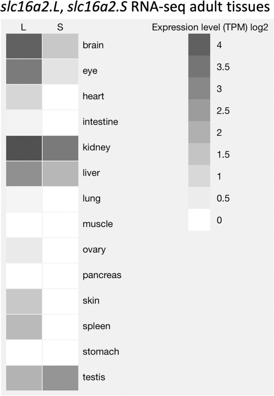 Fig. 2. Expression and tissue distribution of slc16a2.L and slc16a2.S. The expression levels of slc16a2.L and slc16a2.S among adult tissues of X. laevis are represented by shades of gray that indicate log2 of total counts per million (TCM) from RNA-seq data. This figure was obtained using the data visualization tool on XenBase (Karimi et al., 2018).