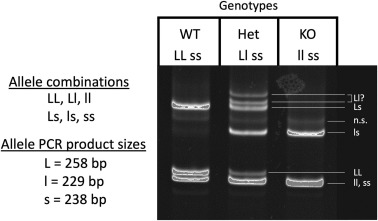 Fig. 3. slc16a2 genotyping using the heteroduplex migration assay. All tadpoles used in the growth and development experiments were F3 offspring from the F2 cross Llss × Llss, where both parents were heterozygous for the MCT8 mutation on the L-chromosome and homozygous for the MCT8 mutation on the S-chromosome. The three possible genotypes from this cross were LLss, designated as “wild-type” (WT), Llss, designated as “heterozygous” (HET), and llss, designated as knockout (KO). PCR amplification of a DNA region around the CRISPR target site from each of these genotypes followed by melting and reannealing of the PCR products results in a total of 6 possible allele combinations, namely LL, ll, ss (homoduplexes) and Ll, Ls, ls (heteroduplexes). When run on an 8 % PAGE gel, the reannealed DNA homo- and heteroduplexes can be identified as shown on the gel image based on the allele PCR product sizes. Genotypes were assigned based on their unique set of bands on the gel. n.s. = non-specific.