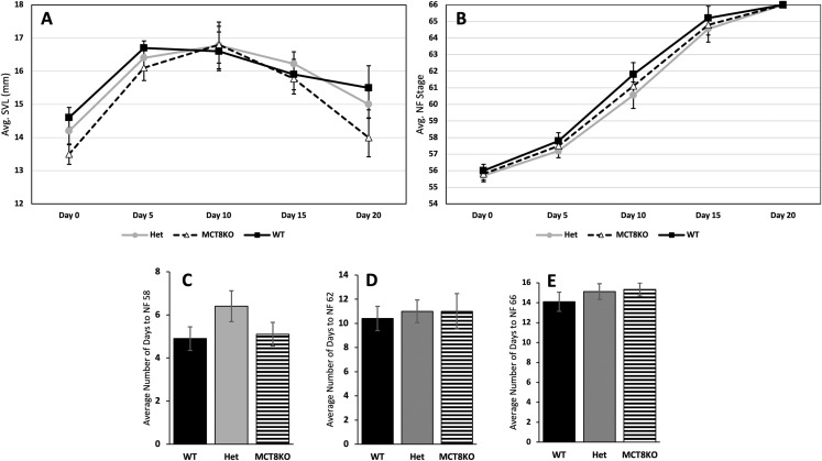 Fig. 4. Growth and development in MCT8 mutant tadpoles. Genotyped and individually reared tadpoles were (A) measured for snout-vent length (SVL) and (B) staged according to Nieuwkoop and Faber (NF) every 5 days starting at the beginning of metamorphosis (NF stage 54, limb bud outgrowth) to the end of metamorphosis (NF stage 66, complete tail resorption). In addition, tadpoles were monitored daily to record exact number of days after NF 54 to achieve (C) forelimb emergence (NF 58), (D) metamorphic climax (NF 62), and (E) tail resorption (NF 66). Means and standard error for each genotype are shown, n = 10 per genotype. WT = wild-type (LLss), Het = heterozygous (Llss), MCT8KO = homozygous knockout (llss). No statistical differences were found using one-way ANOVA, p < 0.5.