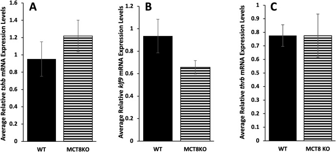 Fig. 5. Gene expression of tshb, klf9, and thrb in the brain at metamorphic climax among MCT8 genotypes. Genotyped F3 tadpoles were reared to metamorphic climax (NF 62), then brain including the pituitary was harvested and processed for quantitative PCR to measure RNA expression of the pituitary gene (A) thyroid stimulating hormone beta (tshb) and the TH response genes, (B) Krüppel-like factor 9 (klf9) and (C) TH receptor beta (thrb). Means and standard error for each genotype are shown, n = 7 for wild-type (WT, LLss), 9 for homozygous MCT8 knockout (MCT8KO, llss). No statistical differences were found using one-way ANOVA, p < 0.5.