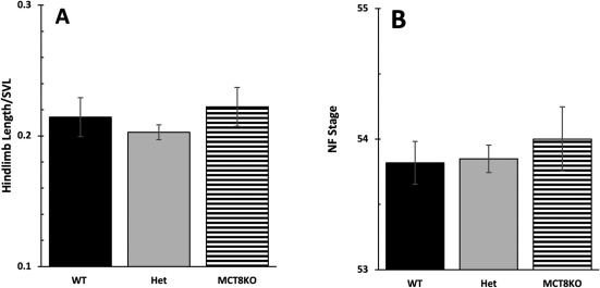 Fig. 6. Initiation of metamorphosis among MCT8 genotypes. To detect an effect of MCT8 on the initiation of metamorphosis, we examined start of limb outgrowth (NF 54) with respect to tadpole size. 79 tadpoles were measured for snout-vent length (SVL) and staged according to Nieuwkoop and Faber (NF) at 21 days post fertilization followed by genotyping. We compared (A) hindlimb length normalized to SVL and (B) NF stage among genotypes. Means and standard error for each genotype are shown, n = 14 for wild-type (WT, LLss), 53 for heterozygous (Het, Llss), 12 for homozygous MCT8 knockout (MCT8KO, llss). No statistical differences were found using one-way ANOVA, p < 0.5.