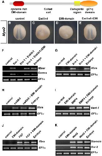 Figure 2. Emilin1 Inhibits Nodal/TGF-β Signaling through the EMI Domain(A) Schematic representation of the structure of Emilin1 protein. The EMI domain at the N terminus is a cysteine-rich region distinctive of the EDEN protein family.(B�E) Overexpression of Emilin1 attenuates mesoderm development in Xenopus embryos through the EMI-domain. Eight cell-stage embryos were injected in the marginal zone with mRNAs encoding for full-length Emilin1 (2 ng) (C), EMI-domain alone (400 pg) (D), or a deleted version of Emilin1 (2 ng, Emilin1δEMI) lacking the EMI-domain (E). The embryos were processed by in situ hybridization for the paraxial mesoderm marker MyoD. Similar results were obtained by staining gastrula stage embryos with the pan-mesodermal marker VegT (Figure S2).(F and G) Emilin1 inhibits nodal/TGF-β signaling, and this requires the EMI-domain. Two cell-stage embryos were injected in the animal pole with the indicated mRNAs. Animal caps were explanted at stage 9 and harvested at stage 11 for RT-PCR analysis. (F) Activation of the mesoderm markers Eomes and Mixer by Xnr-1 mRNA (60 pg) is antagonized by Emilin1 mRNA but not by Emilin1δEMI mRNA. (G) Overexpression of EMI-domain mRNA is sufficient to inhibit mesoderm induction by coinjected Xnr-1. As shown in Figure S2, induction of ectopic bottle cells or axial structures, typical effects of TGF-β/Nodal/Smad signaling, is also antagonized by Emilin1.(H) RT-PCR of animal caps explanted from embryos injected as in (F) with constitutive-active (ca)-TGF-β type I receptor (Alk5) mRNA (100 pg) alone or in combination with EMI-domain mRNA (800 pg). Emilin1 acts upstream of TGF-β receptor activity.(I�K) Embryos were injected as in (F) with EMI-domain mRNA (800 pg) in combination with BMP2, eFGF, or Xwnt8 mRNAs (100 pg, 2 pg, and 20 pg, respectively). Explanted animal caps were analyzed by RT-PCR for the indicated markers. EF1α serves as loading control.