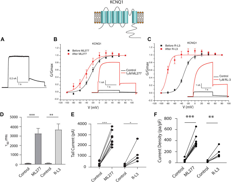FIGURE 1. ML277 and R-L3 modulate wild type IKS channels in the absence of KCNE1. Individual current traces recorded in response to 2 s depolarizing steps to +60 mV from (A) 70 mV holding potential are shown as insets in panels (B,C). Currents are shown in the absence (black traces) and presence (red traces) of test drugs. (A). Control drug-free recording of wild type KCNQ1 channel activity. (B). KCNQ1 conductance-/voltage relationships recorded in the absence (black) and presence (red) of 1 μM ML277. (C). KCNQ1 conductance-/voltage relationships recorded in the absence (black) and presence (red) 1 μM R-L3. (D). Deactivation tail time constants measured at −40 mV in the absence (control) and presence of 1 μM ML277 and 1 μM R-L3. (E). KCNQ1 tail current amplitude (measured at −40 mV) in the absence (control) and presence of ML277 (1 μM) and R-L3 (1 μM). (F). Current density measured at +60 mV for the conditions indicated on the abscissa. Data from individual experiments in (E,F) are connected by straight lines.