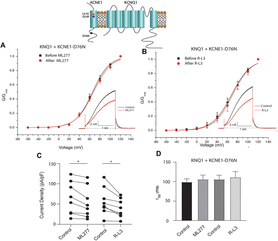 FIGURE 3. ML277 and R-L3 do not enhance channel activity carried by KCNQ1 expressed with the D76N mutant KCNE1 subunit. (A). Conductance voltage curves of KCNQ1-D76N channels in the absence (black) and presence (red) of 1 μM ML277. (B). Conductance voltage curves of KCNQ1-D76N channels in the absence (black) and presence (red) of 1 μMR-L3. (C). Tail current density measured at −40 mV in the absence (control) and presence of 1 μM ML277 and 1 μM R-L3. Data from individual experiments are connected by straight lines. (D). Deactivation time constants measured at −40 mV in the absence (control) and presence of 1 μM ML 277 and 1 μM R-L3.