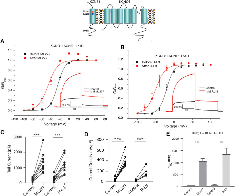 FIGURE 4. Potentiation of KCNQ1-L51H channel activity by ML277 and R-L3. (A). Normalized conductance/voltage relationship for KCNQ1/KCNE1-L51H channels before (black traces) and after (red traces) application of 1 μM ML277. The inset shows representative currents recorded at +60 mV. (B). Normalized conductance/voltage relationship for KCNQ1/KCNE1-L51H channels before (black traces) and after (red traces) application of 1 μM R-L3. The inset shows representative currents recorded at +60 mV. (C). Tail current amplitudes measured at −40 mV in control and 1 μM ML277 and 1 μM R-L3 solutions. (D). Summary data for KCNQ1/KCNE1-L51H peak current density measured 2 s at +60 mV in the absence and presence of 1 μM ML277 and 1 μM R-L3. Data in each cell are connected by straight lines. (E). Summary of measurement of slow deactivation time constant (τ50) in the absence and presence of both drugs. ML277: n = 10; R-L3: n = 9.