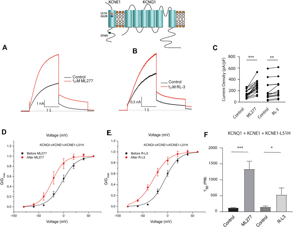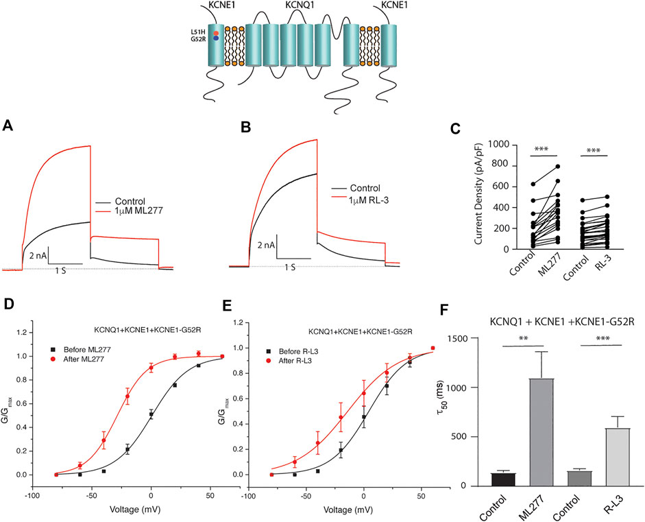 FIGURE 7. Heterozygous KCNE1-G52R mutant channel activity is potentiated by KCNQ1 agonists. Cells were transfected with KCNQ1/KCNE1/KCNE1-G52R and exposed to 1 μM ML277 (A) and 1 μM R-L3 (B). Transfections were carried out with KCNQ1 and KCNE1 WT and KCNE1 mutant ratios of 1:0.5:0.5 as described in the text. Currents recorded at +60 mV are shown before (black traces) and after (red traces) exposure to drugs. (C). Summary data for current density measured at +60 mV at 2 s in which straight lines connect peak current in the absence and presence of drugs in individual cells. (D). Normalized KCNQ1/KCNE1/KCNE1-G52R conductance/voltage curves measured in the absence (black) and presence of 1 μM ML 277 (red). (E). Normalized KCNQ1/KCNE1/KCNE1-G52R conductance/voltage curves measured in the absence (black) and presence of 1 μM RL-3 (red). (F). Summary of slow deactivation time tail constant (τ50) measured at −40 mV in the absence and presence of 1 μM each drug. ML277: n = 14; R-L3: n = 20.