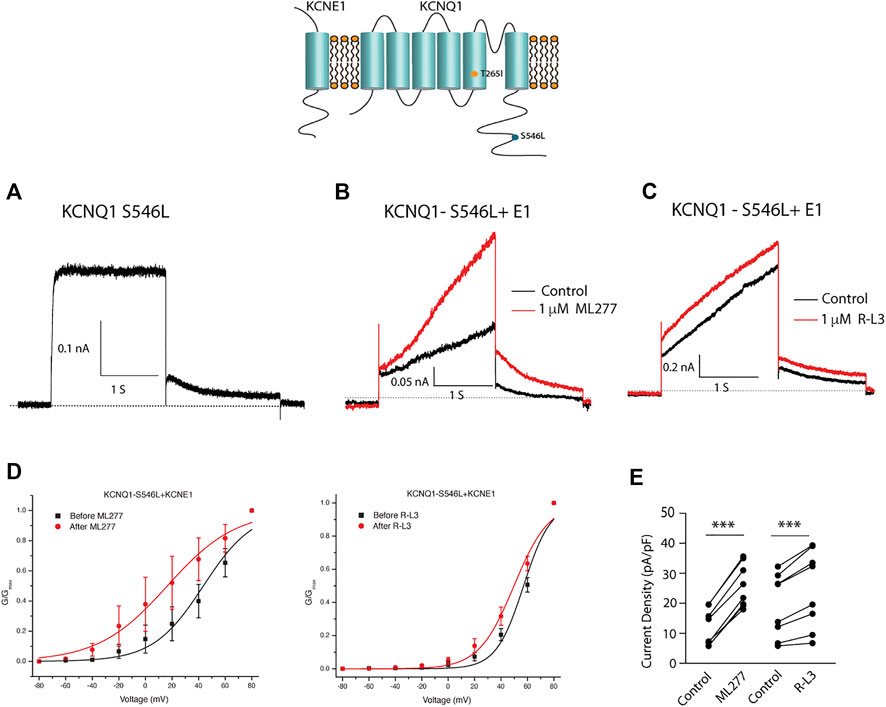 FIGURE 8. Select LQT-1 mutant channel currents are augmented by ML277 and R-L3. (A). Cells were transfected with KCNQ1-S546L without KCNE1. (B). KCNQ1-S546L-KCNE1 channel activity measured at +60 mV in the absence (boack) and presence (red) of 1 µM ML277. (C). KCNQ1-S546L-KCNE1 channel activity measured at +60 mV in the absence (boack) and presence (red) of 1 μM R-L3. (D). Normalized conductance/voltage curves measured in the absence (black curves) and presence (red curves) of 1 μM ML 277 (left panel) or RL-3 (right panel). (E) Summary data for peak currents measured after 2 s depolarization to +60 mV in the absence (control) and presence of 1 µM ML277 or 1 μM R-L3 with straight lines joining recordings for individual cells.