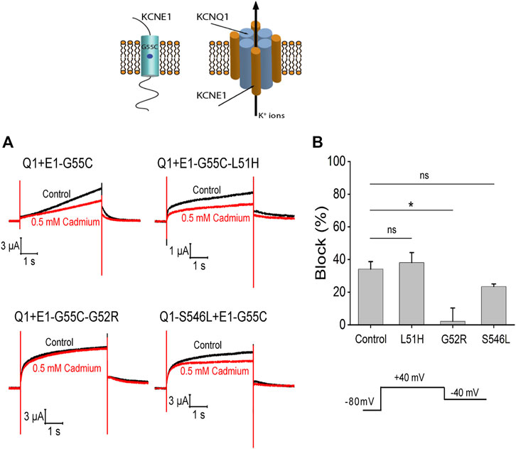 FIGURE 10. Cd2+ sensitivity of KCNQ1 and KCNE1 mutants. (A) Currents in response to voltage step to +40 mV from −80 mV with a tail voltage of −40 mV in the absence (control) and presence of 0.5 mM cadmium. (B) Percent block of 0.5 mM cadmium for each mutation (n > 3). Significance tested by ANOVA with the Dunnett’s test for multiple comparisons with Control (Q1+E1-G55C). Ns = non-significant, *p < 0.05.
