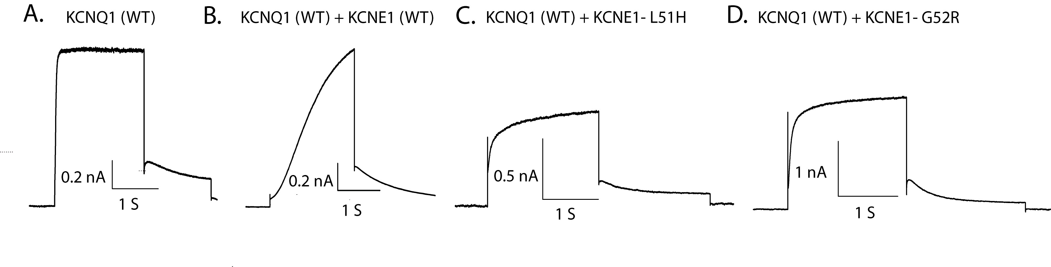 Supplementary Figure S1. Examples of currents elicited by step depolarization to +60 mV in cells expressing WT KCNQ1 (A); WT KCNQ1 expressed with WT KCNE1 (B); WT KCNQ1 expressed with KCNE1-L51H (C); and WT KCNQ1 expressed with KCNE1-G52R.