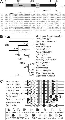 Fig. 1. OTUD3 is highly conserved in evolution. A) OTUD3 protein contains an OTU domain bearing a putative cysteine protease and an UBA interaction site. Of note is a characteristic isoleucine forming the last amino acid of the protein. B) Phylogenetic tree of putative full-length OTUD3 selected from the animal kingdom based on maximum likelihood and bootstrap analysis. The branch length is proportional to the number of substitutions per site. The numbers next to the nodes are bootstrap support values. Branch lengths are scaled based on the estimated divergence, with the scale bar at the bottom of the phylogram indicating the evolutionary distance. There is a 20 % relative divergence observed over time. Notably, mammals, birds, fishes, and amphibians show a close phylogenetic lineage. C) Synteny analysis of OTUD3/otud3: The location and orientation of OTUD3/otud3 in the respective genomes is conserved. Each arrow stands for a single gene while the arrowhead indicates the direction of the open reading frame (ORF). OTUD3/otud3 (black arrow) is present in all analyzed species. In all species except zebrafish, up- and downstream OTUD3/otud3 is flanked by the same genes. Abbreviations: GenBank Accession numbers, GBA-no.; bb, Branchiostoma belcheri (lancelets), GBA-no. XM_019782191; cg, Crassostrea gigas (Pacific oyster), GBA-no. XM_011447637; Coturnix japonica (Japanese quail), GBA-no. XM_015882304; dr, Danio rerio (zebrafish), GBA-no. NM_212922; gg, Gallus gallus (domestic chicken), GBA-no. XM_424363; hs, Homo sapiens, GBA-no. NM_015207; Mesocricetus auratus (golden hamster), GBA-no. XM_005081047; md, Monodelphis domestica (opossum), GBA-no. XM_001377743; mm, Mus musculus (house mouse), GBA-no. NM_028453; Oryctolagus cuniculus (common rabbit), GBA-no. XM_002716005; Pan troglodytes (common chimpanzee), GBA-no. XM_513073; Rattus norvegicus (common rat), GBA-no. NM_001191983; sp, Strongylocentrotus purpuratus (purple sea urchin), GBA-no. XM_001191596; Takifugo rubripes (pufferfish), GBA-no. XM_003962965; xl, Xenopus laevis (African claw frog), GBA-no. NM_001095317; xt, Xenopus tropicalis (Western claw frog), GBA-no. NM_001005056. |