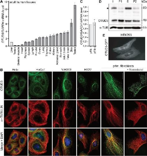 Fig. 2. Analysis of OTUD3 expression. (A) Relative transcript levels of OTUD3 mRNA in total RNA preparations from adult human tissues (BD Biosciences Clontech). OTUD3 mRNA levels were normalized to expression level of human liver. OTUD3 mRNA was detected in all tissues investigated. Highest levels of OTUD3 mRNA were measured in testes and skin. Notably, strong expression was found in adult and fetal brain. (B) OTUD3 in several human and mouse cell lines localized mainly in cytosol and, to a lesser extent, into the nucleus. HeLa: human malignant epithelial cells; HaCaT: human aneuploid immortal keratinocytes; NIH3T3: mouse embryonic fibroblasts; HT22: mouse hippocampal neuronal cells; pFib: human primary fibroblasts. Nuclear DNA was stained with DAPI (blue). Note the prominent co-staining of OTUD3 and alpha-TUBULIN, which, upon treatment with nocodazole, was strongly reduced in primary fibroblasts. (C) Relative OTUD3 transcript levels in primary fibroblasts measured by quantitative PCR. OTUD3 was present in polymerized tubulin fraction. Wildtype OTUD3 was overexpressed in HeLa cells. (D) By differential ultra-centrifugation, cell lysates (I) were fractionated into a nuclear/debris fraction (P1), a soluble (S), and an insoluble pellet fraction (P2). Samples of each fraction were loaded on SDS PAGE gel. Western blot was performed applying anti-OTUD3 antibody (Novus Biologicals, 1:200). Anti-α-tubulin antibody (Sigma, 1:500) was used as loading control. (E) Transfection of HEK293T cells with a plasmid encoding an OTUD3-GFP fusion protein also indicates the association of OTUD3 with tubulin filaments. (For interpretation of the references to color in this figure legend, the reader is referred to the web version of this article.) |