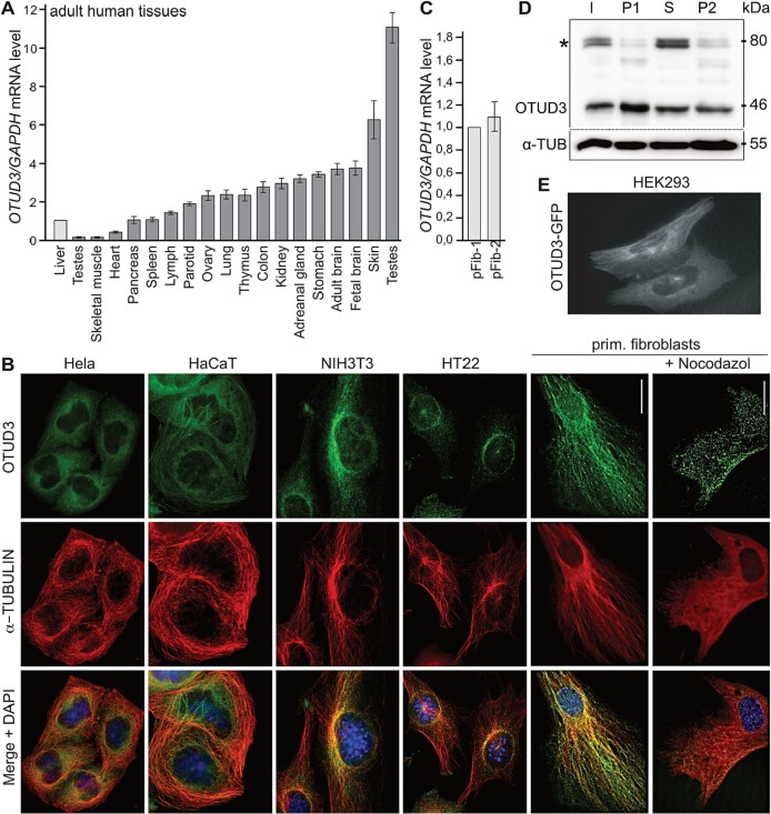 Fig. 2. Analysis of OTUD3 expression. (A) Relative transcript levels of OTUD3 mRNA in total RNA preparations from adult human tissues (BD Biosciences Clontech). OTUD3 mRNA levels were normalized to expression level of human liver. OTUD3 mRNA was detected in all tissues investigated. Highest levels of OTUD3 mRNA were measured in testes and skin. Notably, strong expression was found in adult and fetal brain. (B) OTUD3 in several human and mouse cell lines localized mainly in cytosol and, to a lesser extent, into the nucleus. HeLa: human malignant epithelial cells; HaCaT: human aneuploid immortal keratinocytes; NIH3T3: mouse embryonic fibroblasts; HT22: mouse hippocampal neuronal cells; pFib: human primary fibroblasts. Nuclear DNA was stained with DAPI (blue). Note the prominent co-staining of OTUD3 and alpha-TUBULIN, which, upon treatment with nocodazole, was strongly reduced in primary fibroblasts. (C) Relative OTUD3 transcript levels in primary fibroblasts measured by quantitative PCR. OTUD3 was present in polymerized tubulin fraction. Wildtype OTUD3 was overexpressed in HeLa cells. (D) By differential ultra-centrifugation, cell lysates (I) were fractionated into a nuclear/debris fraction (P1), a soluble (S), and an insoluble pellet fraction (P2). Samples of each fraction were loaded on SDS PAGE gel. Western blot was performed applying anti-OTUD3 antibody (Novus Biologicals, 1:200). Anti-α-tubulin antibody (Sigma, 1:500) was used as loading control. (E) Transfection of HEK293T cells with a plasmid encoding an OTUD3-GFP fusion protein also indicates the association of OTUD3 with tubulin filaments. (For interpretation of the references to color in this figure legend, the reader is referred to the web version of this article.) |