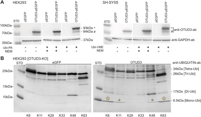 Fig. 3. OTUD3 catalytic activity and specificity. (A) The activity of OTUD3 cysteine protease function was measured upon transfection of cell lysates of HEK293T and SH-SY5Y with OTUD3-GFP (SH-SY5Y, Suppl. Fig. 1A; full western blots, Suppl. Fig. 1B). Cell lysates were incubated in the presence or absence of 1 μg ubiquitin-propargylamide protein (Ubi-PA) or ubiquitin-vinylmethylester (Ubi-VME). NEM was added to block protease activity to control specificity. An anti-GAPDH blot is shown as loading control. (B) OTUD3-KO cells (HEK293T) were transfected with either GFP or OTUD3-GFP. Tetra-ubiquitin chains of a defined linkage type were incubated with GFP-OTUD3 protein purified from cell lysates using a GFP trap method. After incubation for 30 min at 37 °C, the reactions were separated on denaturing gradient SDS polyacrylamide gel electrophoresis and silver stained. |