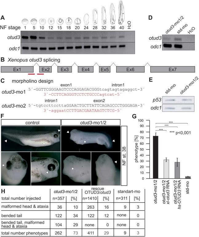 Fig. 4. Suppression of otud3 function interferes with normal anterior development in Xenopus laevis embryos. A) Semi-quantitative RT-PCR revealed high maternal expression of otud3.S and otud3.L. Low levels of otud3 are maintained during consecutive stages of development following gastrulation (NF 12). To monitor RNA input, odc1 expression was analyzed. B) Schematic representation of exon-intron structures of Xenopus laevis otud3 pre-mRNA. Red lines indicate otud3-morpholino1 (otud3-mo1) and otud3-morpholino2 (otud3-mo2) target sites. C) Target sequence of Xenopus laevis otud3 pre-mRNA (black) with corresponding antisense oligonucleotide sequence of otud3-mo1 and otud3-mo2 (red). The PCR primer and morpholino binding sites are conserved in otud3.S and otud3.L. D) Injection of otud3-mo1/2 at the 2-cell stage led to a strong decrease in otud3 transcript level in swimming tadpoles (NF stage 36) compared to standard morpholino (std-mo) as shown by semi-quantitative RT-PCR. E) To exclude off-target effects of otud3-mo1/2 the level of p53 expression was compared to mock (std-mo) injected embryos by RT-PCR. F) Injection of otud3-mo1/2 led to a pleiotropic phenotype including bent tail, malformed head and eyes, reduced pigmentation, and ataxia (NF stage 38;) compared to mock injected controls. G) Statistical evaluation of morphant phenotypes from three independent experiments (total of 300–400 embryos per experiment). 73 % of otud3-mo1/2 injected embryos showed the morphant phenotype at tadpole stage (black). Co-injection with synthetically capped Xenopus otud3 RNA (otud3-mo1/2 + otud3 RNA; light gray) or synthetically capped human OTUD3 RNA (otud3-mo1/2 + OTUD3 RNA; gray) clearly demonstrate rescue of the morphant phenotype (by approximately 60 %). Only 3 % of control embryos injected with std-mo (dark gray) developed abnormally. The frequencies of the morphant phenotypes are significant (***, p < 0.001; χ2-test). H) A table summarizes the proportion of otud3 morphant phenotypes (otud3-mo1/2; left) and those rescued by OTUD3 RNA co-injection (rescue otud3; right) compared to mock-injections (std-mo). Commonly observed phenotypes include malformed head associated with ataxia (34 %) or bent tails (29 %). The most severely affected morphants showed both phenotypes (10 %) which was not observed under rescue conditions. (For interpretation of the references to color in this figure legend, the reader is referred to the web version of this article.) |