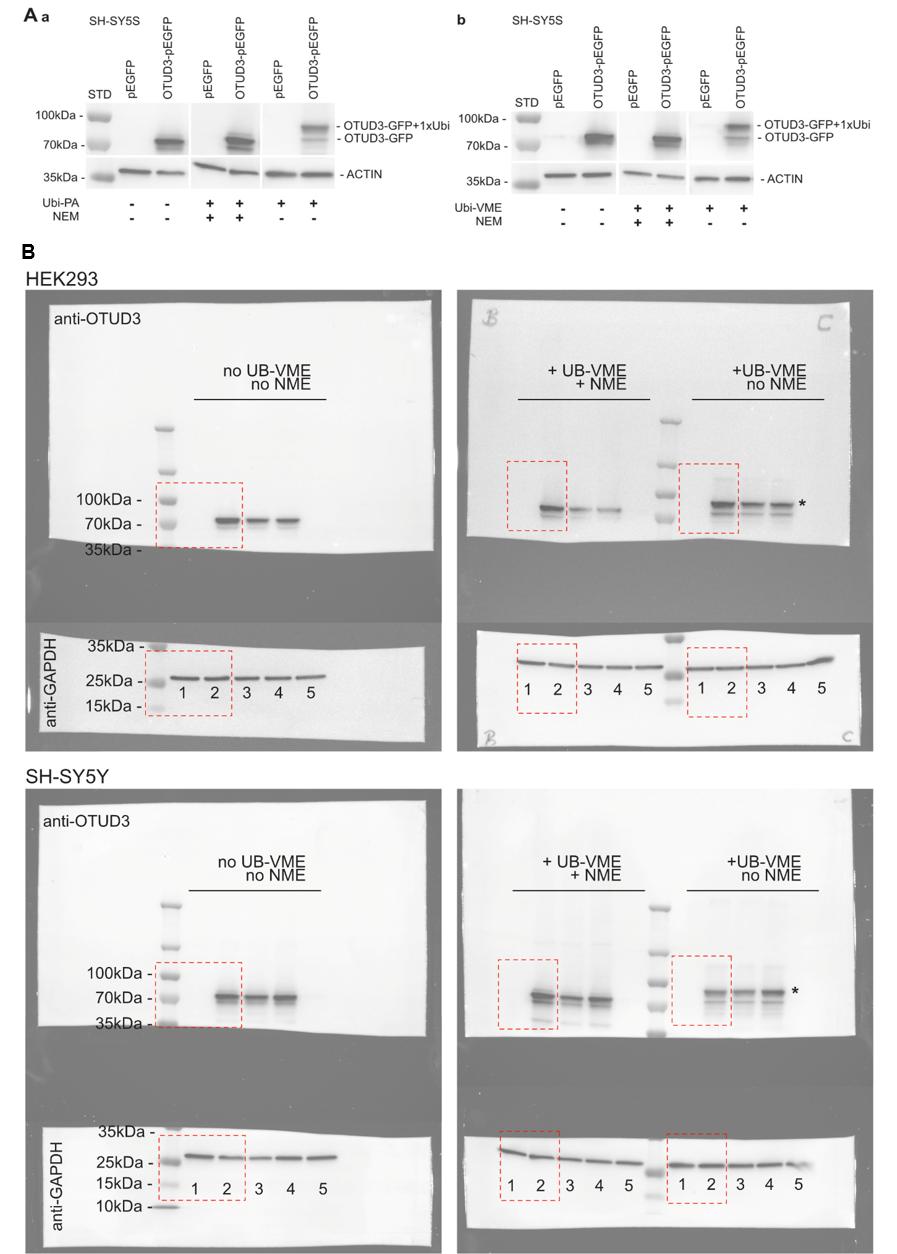 Supplementary figure 1: OTUD3 catalytic activity in SH-SY5Y. (A) The activity of OTUD3 cysteine protease function was measured upon transfection with OTUD3-GFP of SH-SY5Y cell lysates. Cell lysates were incubated in the presence or absence of 1μg ubiquitin-propargylamide protein (Ubi-PA) or ubiquitin-vinylmethylester (Ubi-VME). NEM was added to block protease activity to control specificity. An anti-GAPDH blot is shown as loading control. (B) Raw data. Red dotted lines indicate parts (lane 1+2) of the Western blots that are shown in figure 3 and supplementary figure 1A. Lane 5 represents the potentially catalytic dead variant of OTUD3 C76S. which induced cell death within 24h after transfection. Lane 3+4 are OTUD3 mutant variants that are not referenced in the actual manuscript. Lane 1: Transfected with plasmid pEGFP, lane 2: OTUD3- pEGFP; lane 3: OTUD3- pEGFP-mut1; lane 4: OTUD3- pEGFP-mut2; lane 5: OTUD3- pEGFP-C76S. |