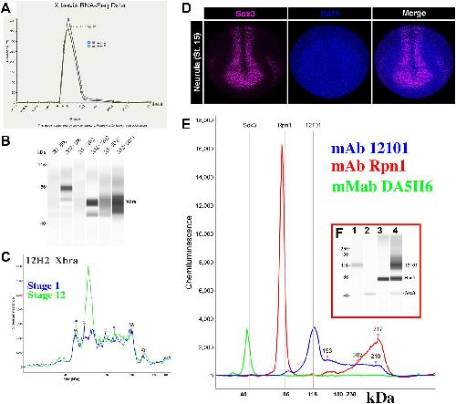 Fig. 4. Secondary screening. (A) RNA-sequencing (RNA-Seq) expression data for Xenopus brachyury (tbxt) from Xenbase. No mRNA is detected for this gene at stage 1 (fertilized egg), but it is strongly expressed during gastrulation (stage 12). (B) Capillary western blot (0.04 embryo equivalent) at stage 1 and stage 12 for three independent hybridomas (8F8, 12H2, 5D11). Note that bands are visible only at stage 12. (C) Signal intensity of the chemiluminescence for clone 12H2 at stages 1 and 12. Note that a single peak is present in stage 12 (green), but not stage 1 (blue), but the background signal is similar. (D) Whole-mount immunofluorescence of a neurula stage embryo. Sox3 is in magenta, and DAPI (to stain nuclei) is in blue. MAb DA5H6sox3 detects the nuclei of cells within the neural plate. (E,F) Chemiluminescence signal (E) from a capillary western blot (F) of embryo extracts (0.04 embryo equivalent per lane) incubated with antibodies to Sox3 (green), Ribophorin1 (Rpn1, red) and the muscle marker 12101 (blue). Antibodies were incubated either separately (lanes 1-3) or together (lane 4).