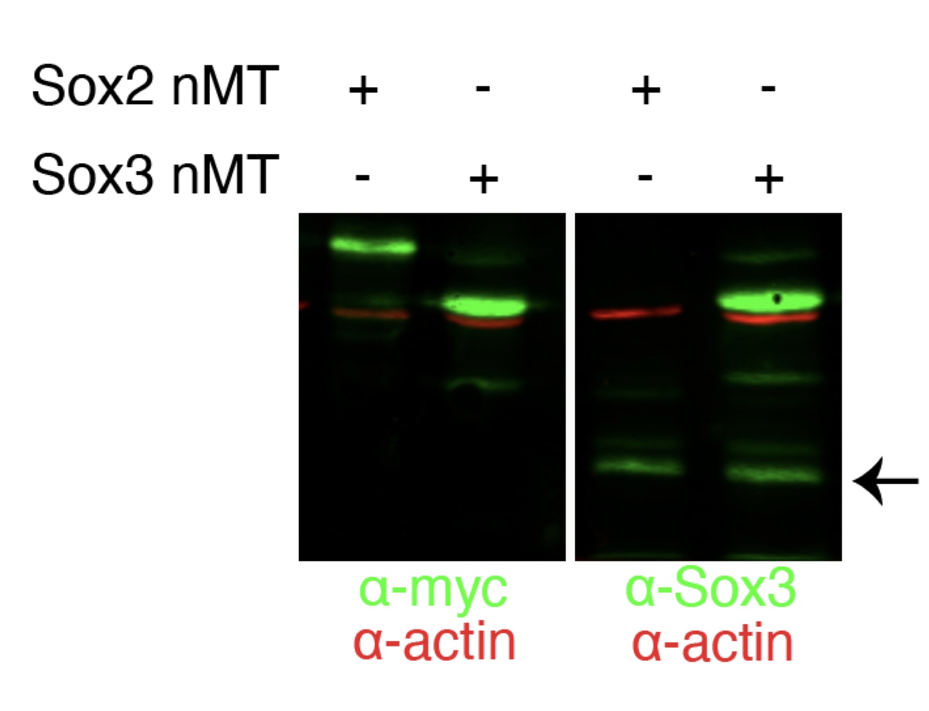 Fig. S1. Western blot of embryos at blastula stage expressing myc-tag Xenopus Sox2 or Sox3. Left blot is using the myc 9E10 monoclonal antibody (Green) and anti actin for loading control (Red). The right blot is performed using the anti Sox3 antibody (DA5H6sox3, Green). Note that the upper band corresponding to Sox2 is not recognized by mAb DA5H6sox3.