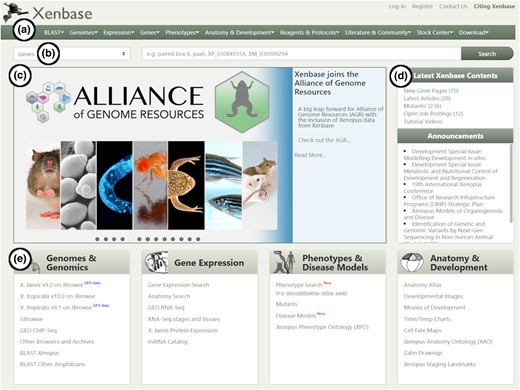 Xenbase landing page. a) Header menu dropdowns. b) Quick search bar. c) Latest news slideshow. d) Sidebar with summary of recently added data and recent community announcements. e) Tiled view of key topic categories and quick access links.