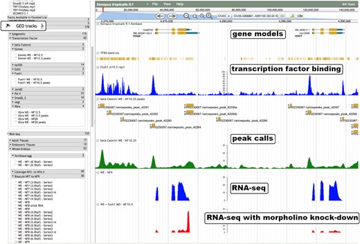 Track types available on Xenbase JBrowse. The Xenbase JBrowse instance provides many different track types, such as gene and transcript models, transcription factor binding site data, and RNA-seq data. To the left of the main display is the track selection interface which allows categories of tracks to be navigated and selected, also shown is the “GEO tracks” button which opens an alternative faceted browsing interface for selecting processed GEO tracks.
