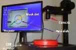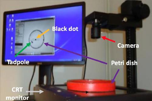 dish (purple arrow) filled up to 1cm with MMR 0.1X medium, where each indivudual tadpole is allowed to swim. Tadpole movements are recorded by a Dragonfly2 DR2-HIBW camera (red arrow). Movements of tadpole (green arrow) and deplacements of the black dot (yellow arrow) are viewed and monitored on the screen. |