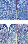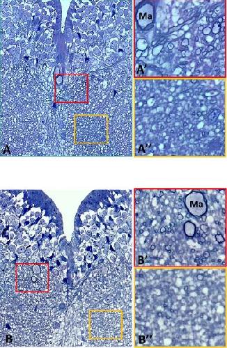 stained with toluidine blue of transgenic Tg(mbp:GFP-NTR) Xenopus tadpoles (stage 50) of either normal control (A) or exposed for 10 days to MTZ (10 mM) (B). Ten days exposure to MTZ resulted in an important degree of demyelination. However, Mauthner axons (Ma) (easily recognizable due to their large diameter) as well as many axons in their vicinity in the medio- dorsal portion of the brain stem resisted the MTZ treatment (higher magnification in insets encircled in red B’ compared to control A’). In comparison latero-ventral axons on the same section are, for most of them, demyelinated (higher magnification in insets encircled in yellow B’’compared to control A’’); Scale bar in A & B = 22 μm. |