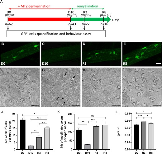 Confocal and electron microscopic illustration of conditional demyelination and spontaneous remyelination of tg(mbp:GFP-NTR) transgenic X. laevis. (A) Flow chart showing the sequence of events tested and the number of tadpoles throughout the experiment. (B–E) Optic nerve of Tg(mbp:GFP-NTR) X. laevis (stage 50 tadpole) before (D0), at the end of metronidazole exposure (D10) and after 3 days (R3) and 8 days (R8) spontaneous recovery; scale bar = 20 µm. (F–I) Electron micrographs of transversal ultrathin sections (70 nm) of optic nerve of transgenic Tg(mbp:GFP-NTR) X. laevis tadpole before (F), at the end of metronidazole exposure (G) and after 3 days (H) and 8 days (I) of spontaneous recovery; in G arrows point to two axons that resisted MTZ-induced demyelination and arrowheads point to myelin debris; scale bar = 5 µm. (J) Quantification of the number of GFP+ oligodendrocytes per optic nerve. (K) Quantification of myelinated axons counted on optic nerve semi-thin (0.5 µm) sections stained with toluidine blue between D0 and R8. (L) Evolution of g-ratio measured on D0, R3 and R8. Data are expressed as mean ± SEM (in K and L, n = 3–4 tadpoles per group), with **P < 0.01, ***P < 0.001 and ****P < 0.0001 calculated using an unpaired two-tailed Student’s t-test between two groups with a 95% confidence interval. |