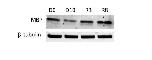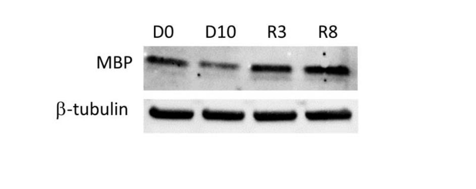 brain extract from transgenic Tg(mbp:GFP-NTR) Xenopus tadpoles at D0, D10, R3 and R8 were fractionated by SDS-PAGE electrophoresis. Proteins were transferred to nitrocellulose membrane and probed with rat-antiMBP antibody showing the major 20 kDa band and the minor band at 18.5 kDa. ß-tubulin was used as a control of loading. |