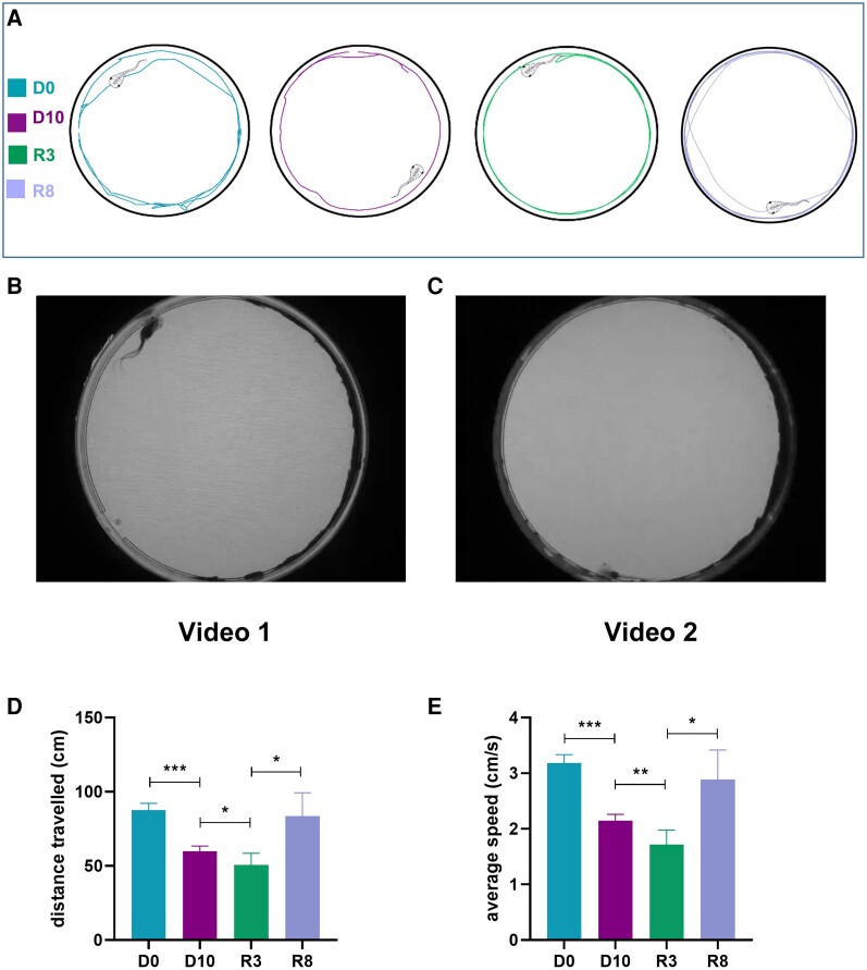 Swimming behaviour of Tg(mbp:GFP-NTR). (A) Traces of distance swam recorded for a period of 30 s on D0, D10 and during the recovery period on R3 and R8. (B and C) Live imaging of the swimming behaviour of a tadpole before demyelination (See Supplementary Video 1) and after 10 days of exposure to MTZ (see Supplementary Video 2). (D and E) Average distance expressed in cm (D) and speed of swimming in cm/s (E) before (n = 62) and at the end of MTZ treatment (n = 43) and during the recovery period R3 (n = 27) and R8 (n = 13). Note that on R3, despite the partial increase in the number of GFP+ cells per optic nerve (Fig. 1J), tadpoles did not improve their performance; however, the recovery was complete on R8.