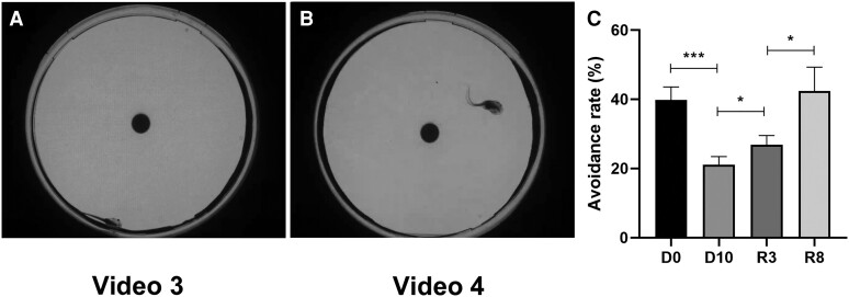 Live tracking of the visual avoidance paradigm. Tg(mbp:GFP-NTR) was recorded before (A and Supplementary Video 3) and at the end of 10 days of exposure to MTZ (end of demyelination period) (B and Supplementary Video 4). The ratio of the number of encounters that resulted in a successful avoidance allowed definition of an avoidance rate (C). Note that the sharp decrease in the avoidance index was not a consequence of an alteration of the swimming behaviour because demyelinated animals were still responding to a touch stimulus with a plastic pipette, as illustrated in Supplementary Video 4 at 22 s.