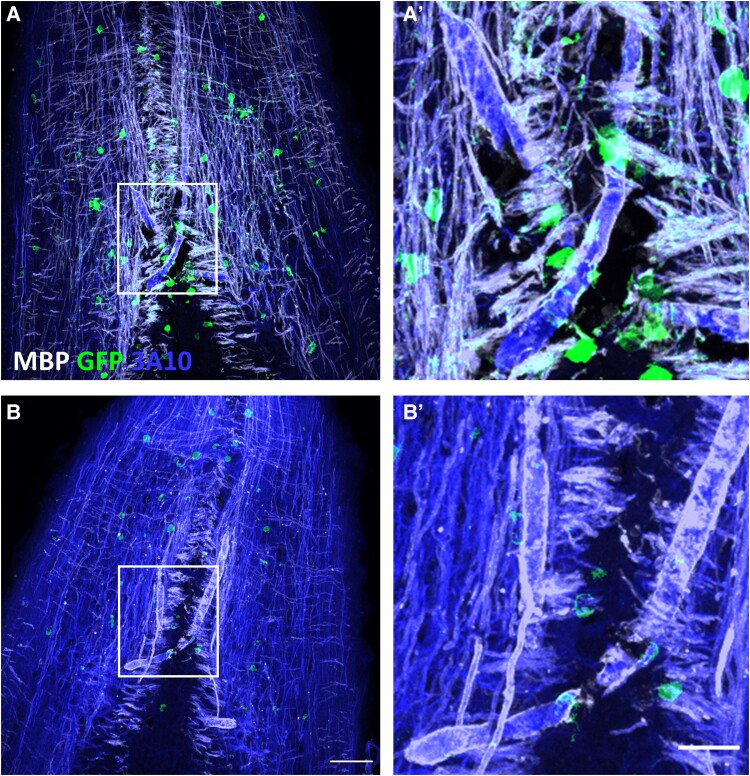 Immunostaining of brainstem at the level of Mauthner axons. Horizontal cryostat section of the brainstem of transgenic Tg(mbp:GFP-NTR) Xenopus tadpoles immunostained for GFP (mature oligodendrocytes), 3A10 (axons) and MBP (myelin sheath around axons) before demyelination (A) and at the end of MTZ exposure (B) causing ablation of about two-thirds of GFP+ oligodendrocytes. Demyelination in B is evidenced by loss of MBP staining around 3A10+ axons. However, demyelination is incomplete and notably the very large Mauthner axons (at higher magnification in A′ and B′) remained MBP positive. Scale bar = 50 µm (A and B) and 20 µm (A′ and B′). |