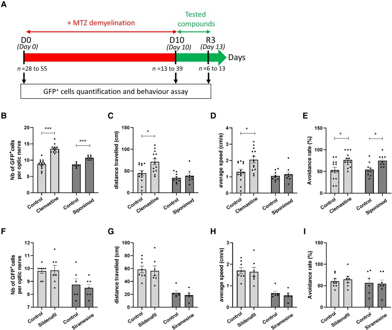 Improvement of visual avoidance index upon remyelination. Transgenic Tg(mbp:GFP-NTR) Xenopus tadpoles (stage 48–50) were treated for 10 days with metronidazole (10 mM) then returned to either fresh water (controls, Ctrl) or water containing the compound to be tested. Three days after the demyelination period (R3) tadpoles were first submitted to the visual avoidance test in the morning and in the afternoon the number of GFP+ cells per optic nerve was counted in vivo. (A) Flow chart showing the sequence of events tested and the number of tadpoles throughout the experiments. B–E show the results for clemastine (200 nM; light grey columns) and siponimod (3 nM; dark grey columns), two molecules which were shown to promote remyelination in our Xenopus model.15 Four parameters have been evaluated: number of GFP+ cells per optic nerve (B), distance travelled (in cm) during 30 s (C), average speed of swimming (in cm/s) (D) and avoidance index (E). F–I show the results for siramesine (5 µM; light grey columns) and sildenafil (1 µM; dark grey columns), two molecules that were previously tested as inefficacious to promote remyelination.15 Neither siramesine nor sildenafil had any pro-remyelination effect either on number of GFP+ cells (F) or on any of the behaviour tests (G–I).