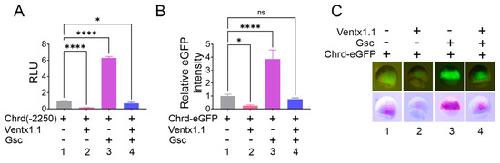 Figure 2. The chrd(-2250) promoter region contains the positive and negative response elements for Gsc and Ventx1.1., respectively. (A) chrd(-2250) was injected with or without gsc (1 ng/embryo) and ventx1.1 (1 ng/embryo) at the one-cell stage. The luciferase reporter gene assay was performed at stage 11. (B) The quantification of eGFP relative fluorescence was analyzed with the embryos shown in (C). The chrd(-2250)eGFP was injected with or without gsc (1 ng/embryo) and ventx1.1 (1 ng/embryo) at the one-cell stage, and fluorescent analysis was performed at stage 10.5. ). * p ≤ 0.1, **** p ≤ 0.0001, and n.s. denotes nonsignificant values.